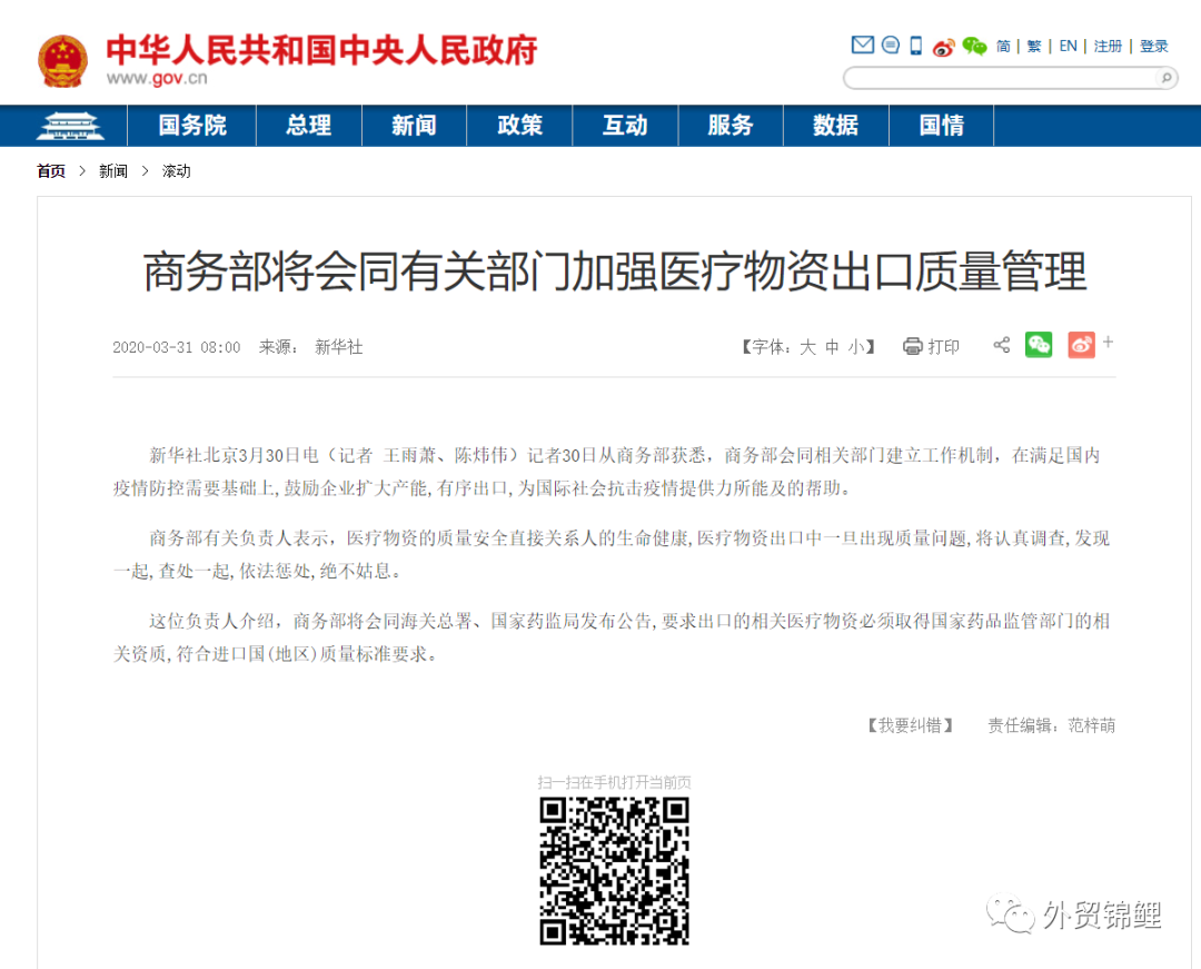 鑒于以上種種情況,商貿(mào)部為了規(guī)范醫(yī)療產(chǎn)品行業(yè),尤以口罩產(chǎn)品為主,已經(jīng)宣布對(duì)當(dāng)前醫(yī)療物資出口增加必要的超常規(guī)管理,督促企業(yè)以更加負(fù)責(zé)任的態(tài)度接單生產(chǎn)并出口。