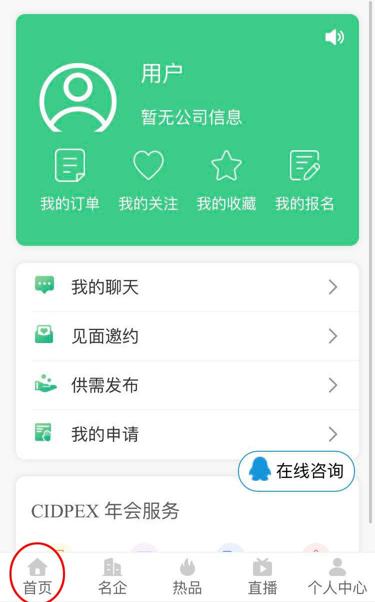 二、登錄進入個人中心后點擊左下角“首頁”返回“首頁”