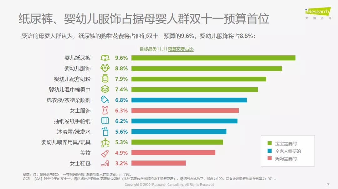 據(jù)艾瑞咨詢《2020年雙十一母嬰品類消費行為前瞻洞察》報告顯示,在對雙十一有明確購物計劃的母嬰人群中,紙尿褲和嬰幼兒服飾占據(jù)母嬰人群雙十一預算首位,其中,紙尿褲的購物花費將占到他們雙十一預算的9.6%,嬰幼兒服飾將占8.8%。