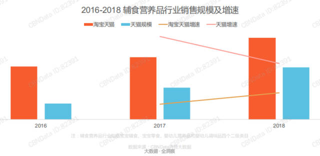 據(jù)CBNData數(shù)據(jù)顯示,2016—2018近三年間無論是在淘寶天貓還是天貓平臺上,輔食營養(yǎng)品的銷售規(guī)模都是在穩(wěn)步提升,特別是天貓平臺增速迅猛,且市場占比逐年大幅提升,2018年天貓平臺在整體淘系營養(yǎng)品銷售份額過半,遠(yuǎn)遠(yuǎn)超過50%。